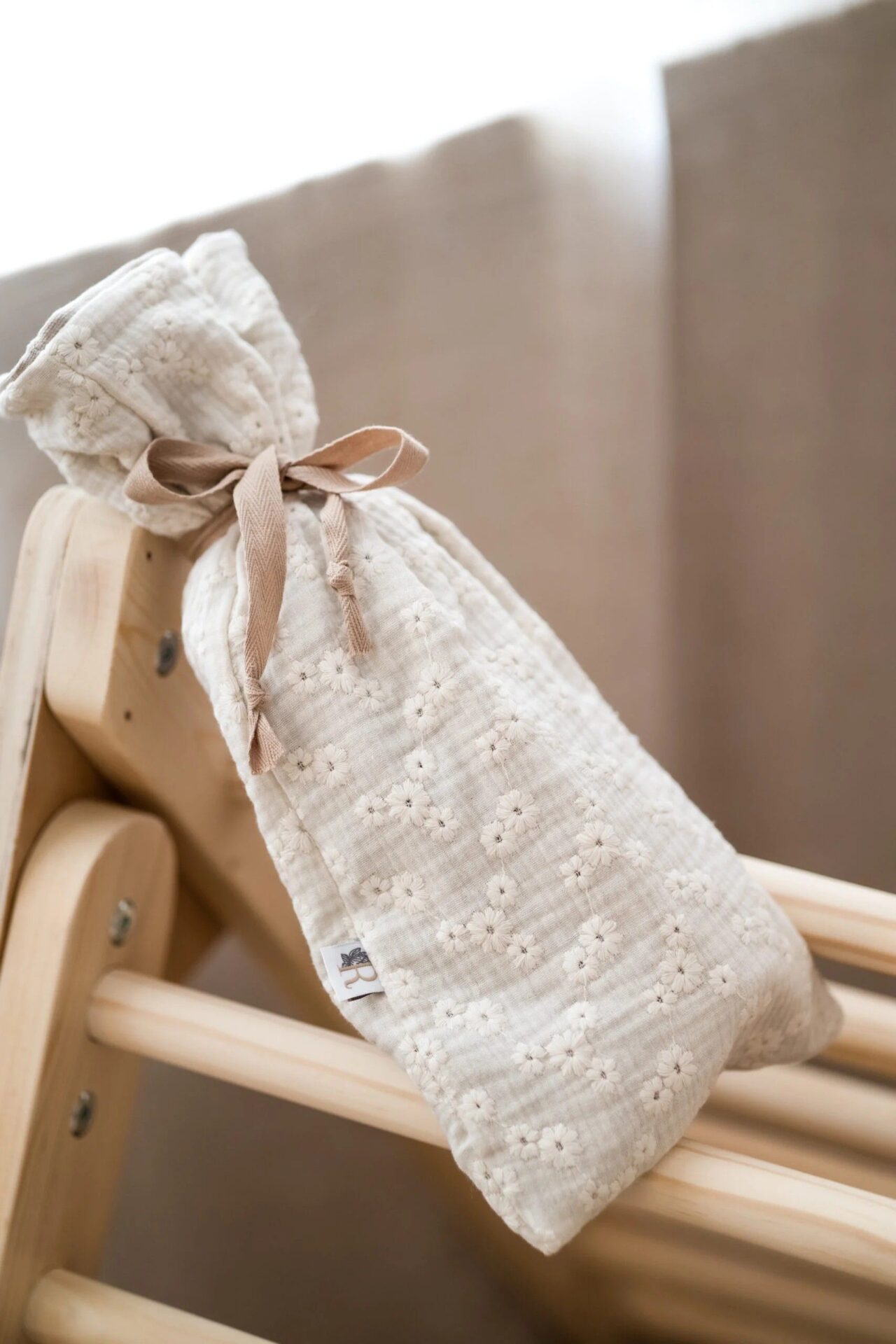 Let op: Ook al word deze kruikenzak met twee stoffen gemaakt zorg ervoor dat wanneer je deze gaat gebruiken je hem niet tegen je baby aanlegt in verband met verbranding.